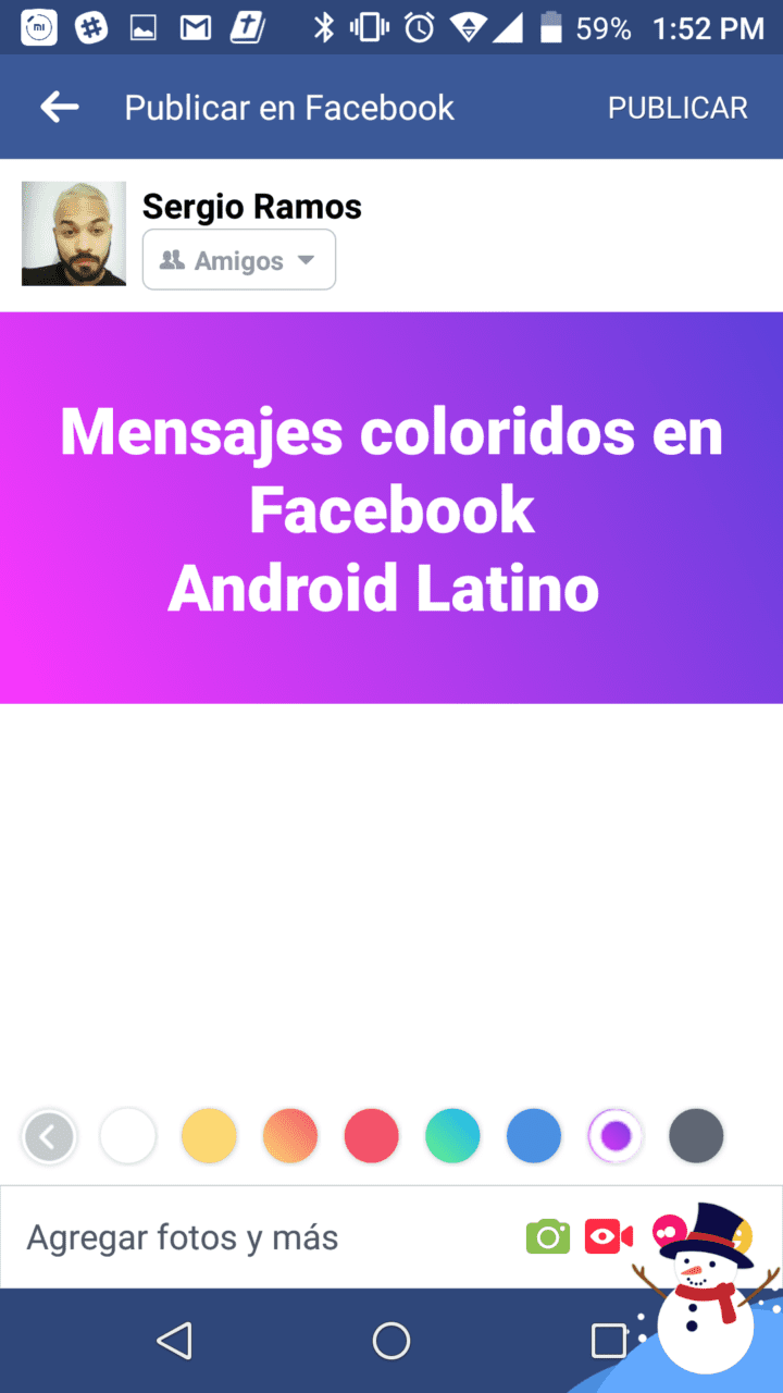 Para publicar un mensaje de este tipo, los usuarios deberán contar en primer lugar con la más reciente versión de Facebook para Android, e ingresar a escribir una publicación, donde inmediatamente podrán observar unos círculos de colores para elegir el lienzo sobre el cual irá el texto.